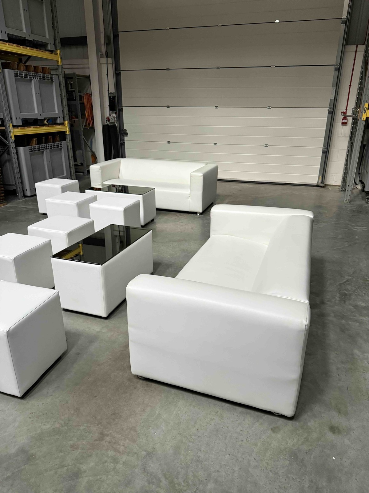 16x Two Seater White Sofas & 6x Coffee Table & 40x White Cube Stools - Berkshire