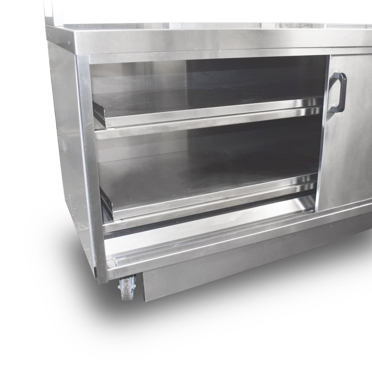 This Hot Cupboard with a double heated gantry constructed from stainless steel is designed to keep contents at a warm and hygienic temperature due to its fully insulated panels.Able to be used as a kitchen pass, the appliance features a large capacity hot cupboard and is easily accessible using a sliding door system both sides whilst the double tier heated gantry uses heat lamps to keep plated counter top food warm and ready for service.