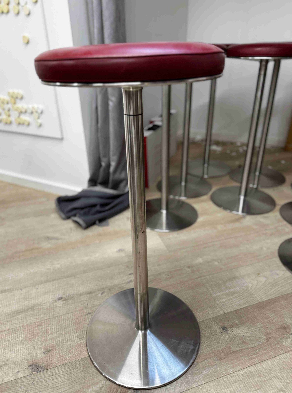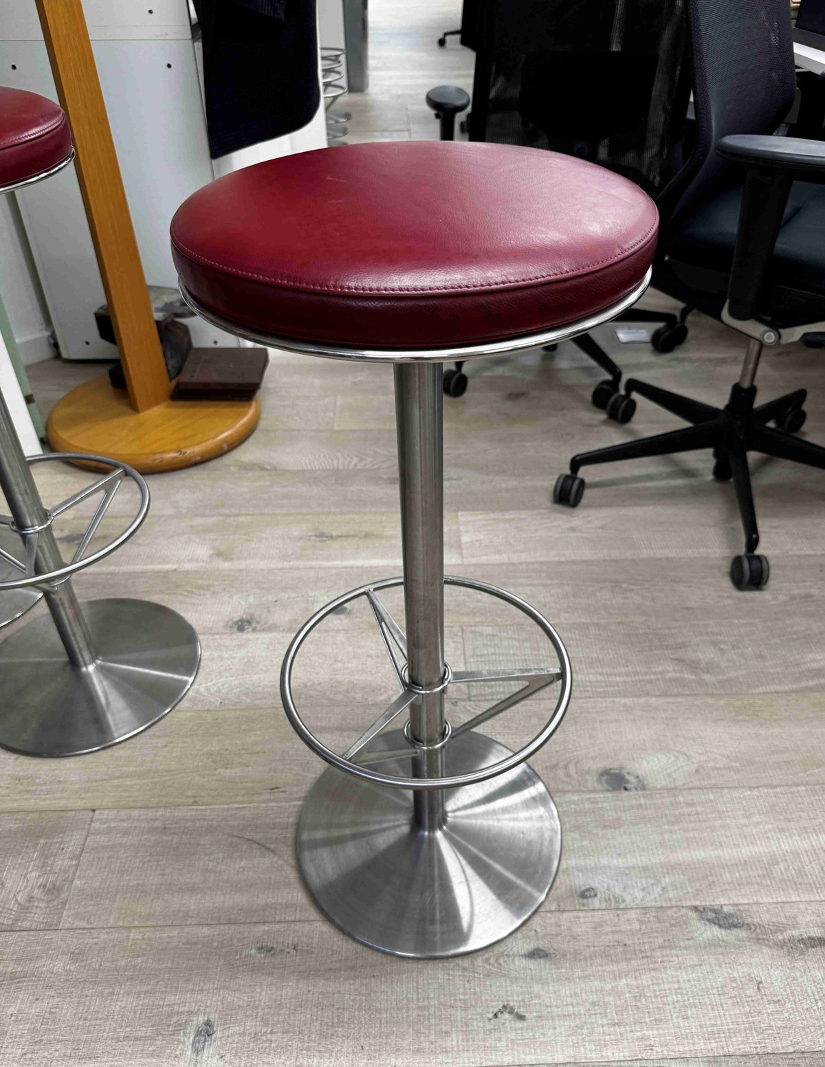 Bar Stools – Red Seat / Chrome BaseModern bar stools with red cushioned seats and chrome bases.