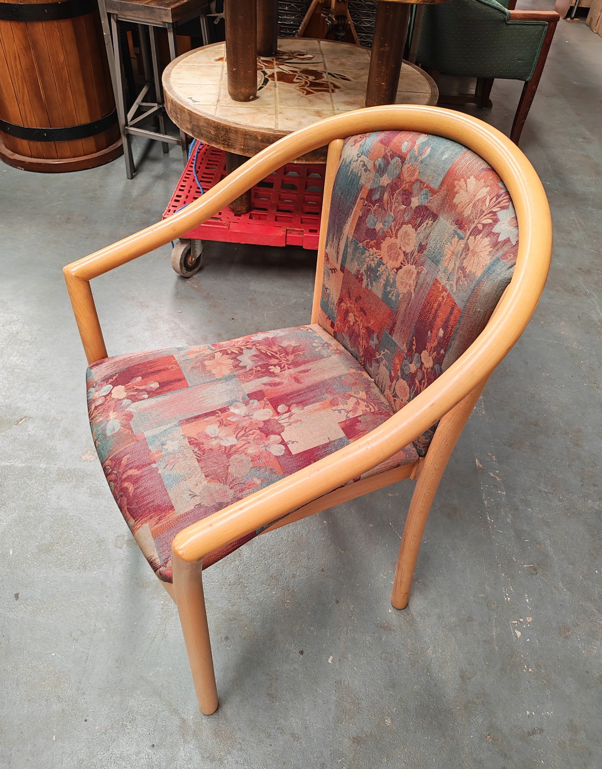 40 No. Comfortable Natural polished Bentwood framed tub chairs with patterned fabric upholstered seat and back with no rips or tears and a structurally sound frame.The chairs measure :